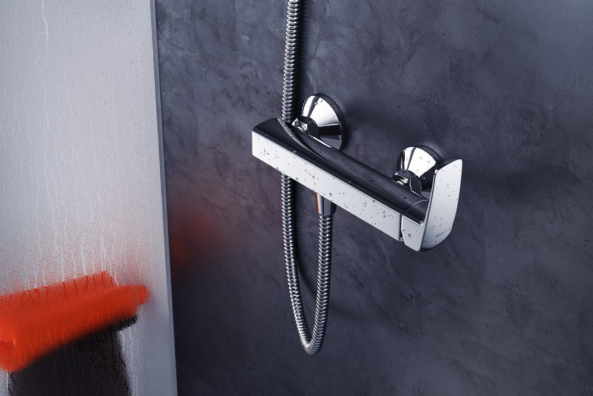 Bateria natryskowa linii AXEL. Wykonana z mosiądzu pokrytego chromem. Pozwala na dużą oszczędność wody dzięki użyciu odpowiedniej jakości elementów uznanych marek (głowica Sedal oraz perlator Neoperl)