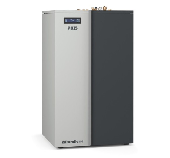 Kocioł na pellet EXTRAFLAME PK15 do C.O. (centralnego ogrzewania) oraz C.W.U. (ciepłej wody użytkowej)• Automatyczny system czyszczenia żeliwnego paleniska