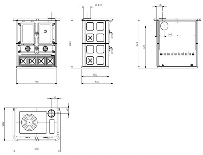 Palenisko i drzwi żeliwne, wysuwany popielnik, górna płyta grzewcza żeliwna z fajerkami, szuflada na drewno. Obudowa wykonana z kafli, dostępna w kolorach: bordowym i kremowym lub w kamieniu naturalnym – steatyt. Powietrze do spalania: pierwotne + system ‚czysta szyba’. Podłączenie wylotu spalin z góry lub z tyłu.