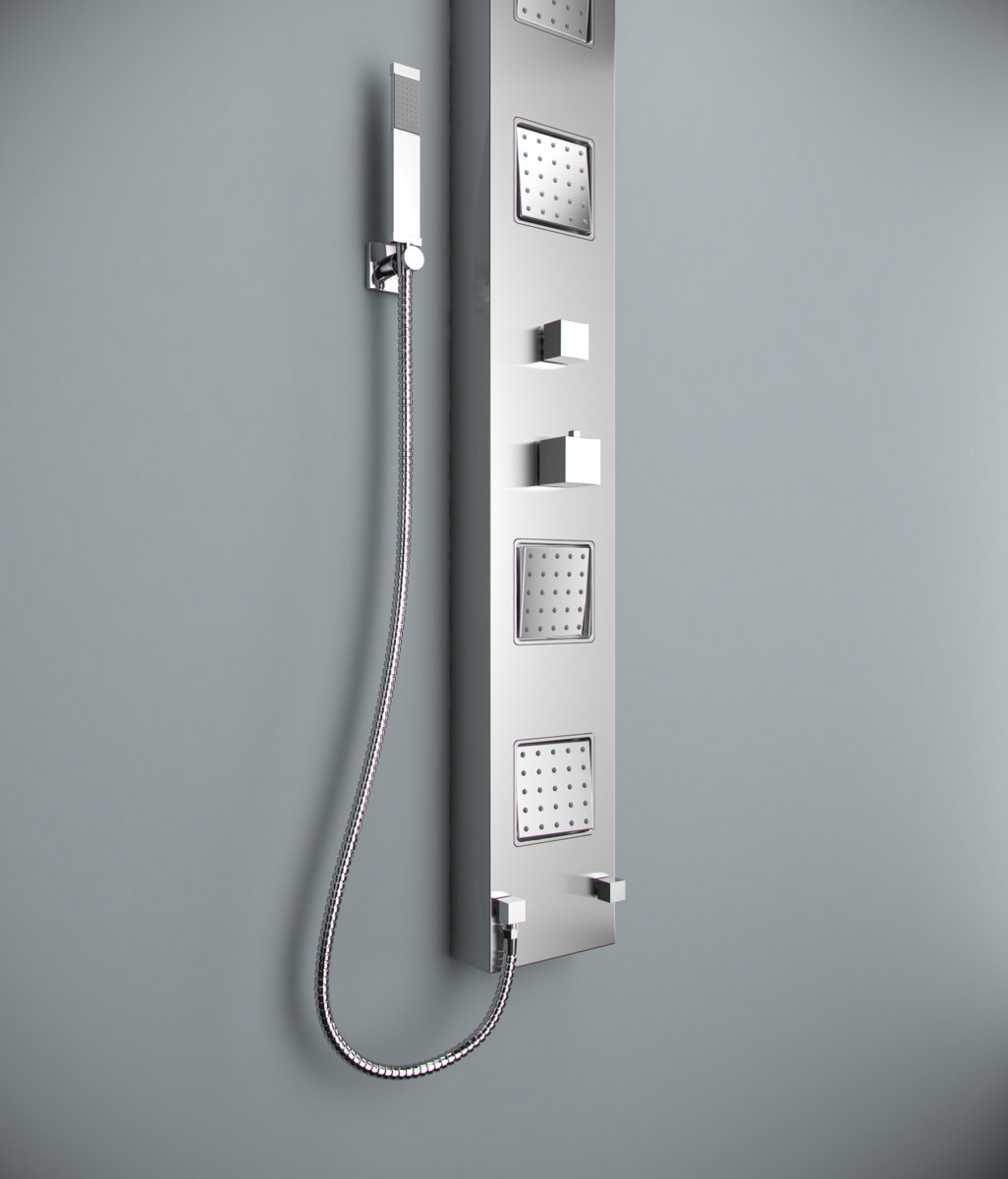 Solidny panel natryskowy ze stali szlachetnej z baterią termostatyczną oraz ruchomymi – wbudowanymi – dyszami natryskowymi. Istnieje również możliwość montażu narożnego.