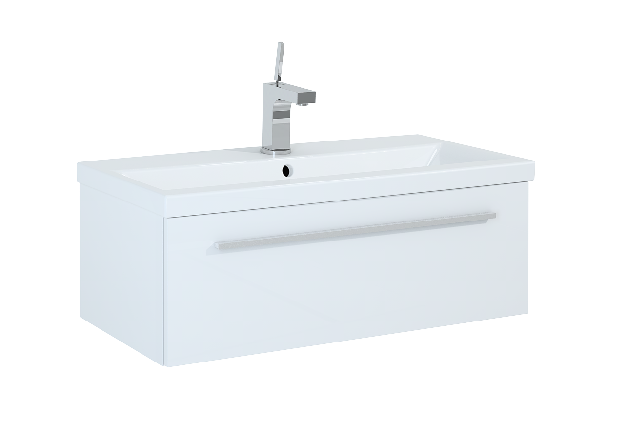 Szafka podumywalkowa Kwadro Slim 80 cm, 1 szuflada z funkcją cichego samodomyku oraz z pełnym wysuwem, wyposażona w praktyczny organizer. Szafka wykonana z materiałów odpornych na działanie wilgoci, front i korpus lakierowany, uchwyty metalowe w kolorze satyna.