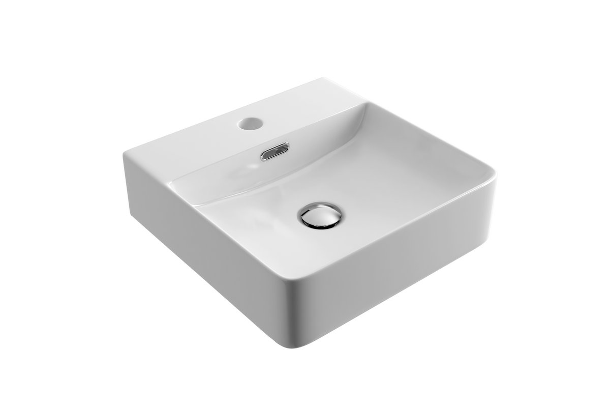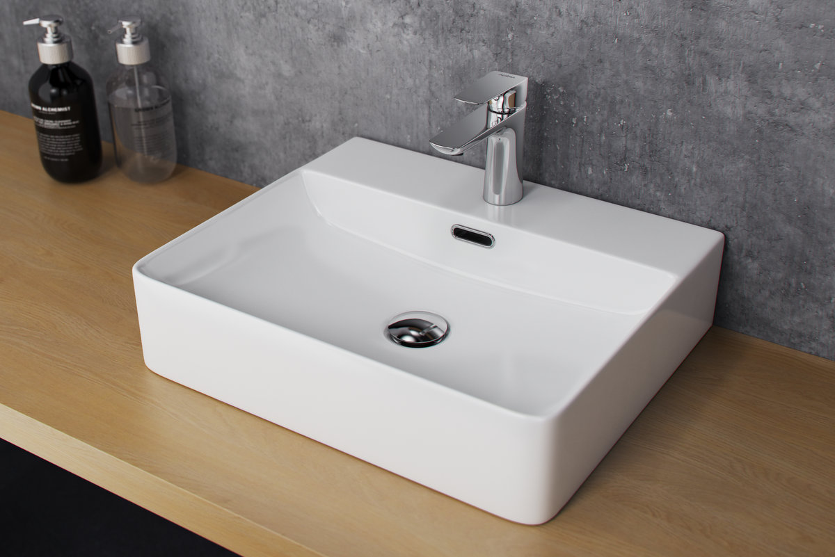 Umywalka nablatowa z przelewem. Dostępna w 3 wariantach wymiarowych.