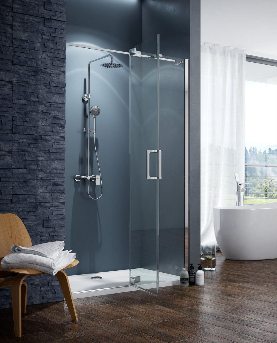 5-cio funkcyjna delikatna słuchawka i cienka deszczownia górna delikatnie dopełniają gładką baterię. Zestaw prysznicowy wyposażony jest również w praktyczny uchwyt na słuchawkę prysznicową, który pozwala na umieszczenie jej na dogodnej wysokości. W baterii zastosowano głowicę Kerox, węgierskiego producenta słynącego z głowic o dużym przepływie oraz 3-funkcyjny przełącznik, który jednocześnie reguluje przełączenie wody pomiędzy wylewką wannową, głowicą i słuchawką prysznicową. Drążek pionowy ma regulowaną długość w zakresie do 150 cm. Wykonany jest z mosiądzu pokrytego chromem. Mocowanie słuchawki oraz mocowanie ścienne są również wykonane z mosiądzu.
